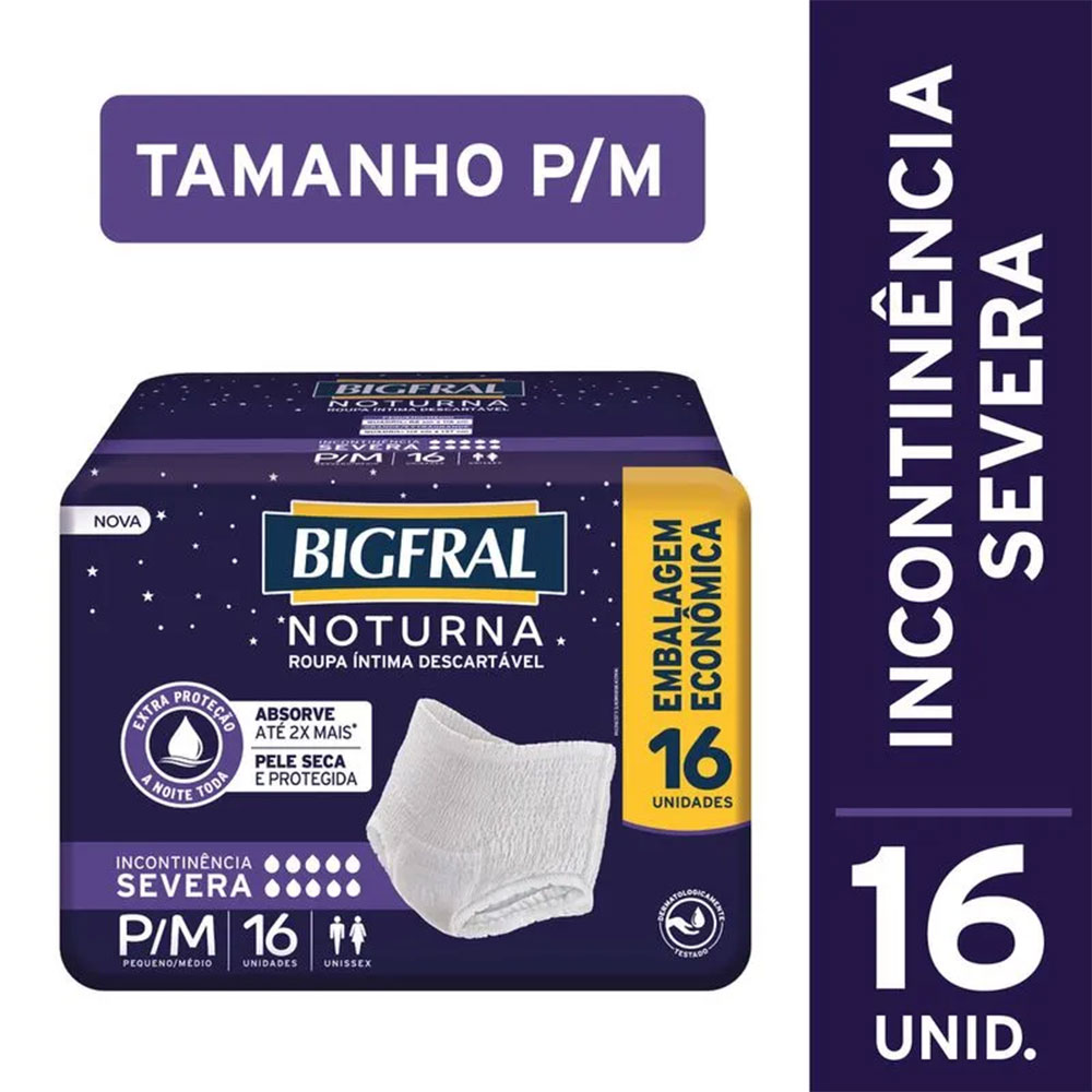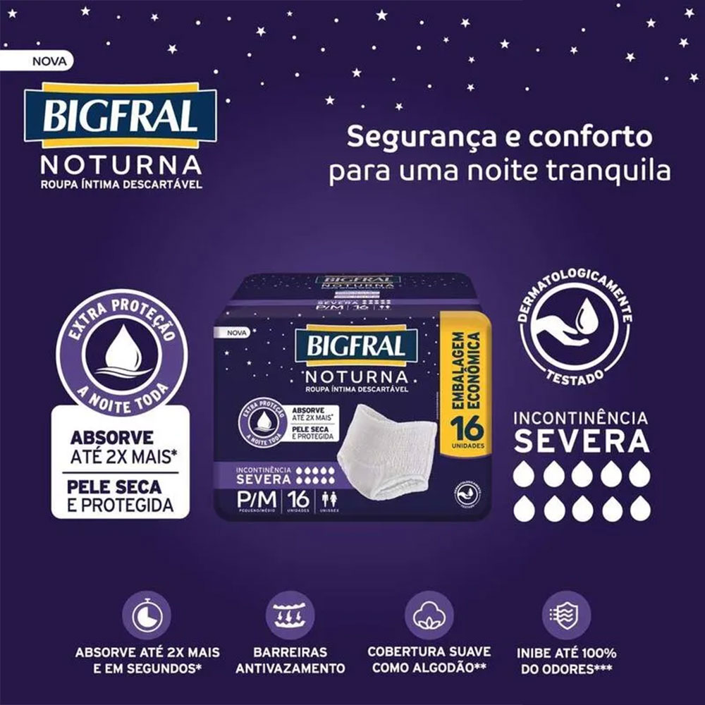 Bigfral Noturna Roupa Íntima Descartável P-M 16 Unidades Pacote Econômico. A Bigfral Noturna Roupa Íntima Descartável é ideal para incontinência severa e pós-parto, desenvolvida para homens e mulheres. Por absorver em segundos e até duas vezes mais, mantém a umidade longe da pele. As barreiras antivazamento trazem extra proteção a noite toda. Sua cintura elástica favorece movimentos livres e seguros e a cobertura suave como algodão garante mais conforto durante o sono.